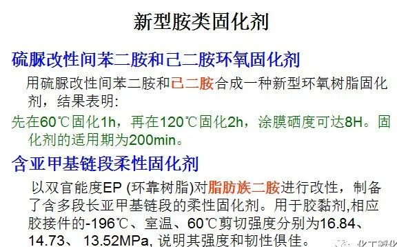 硫脲改性间苯二胺和己二胺环氧固化剂、含亚甲基链段柔性固化剂等一些新型胺类固化剂。