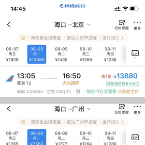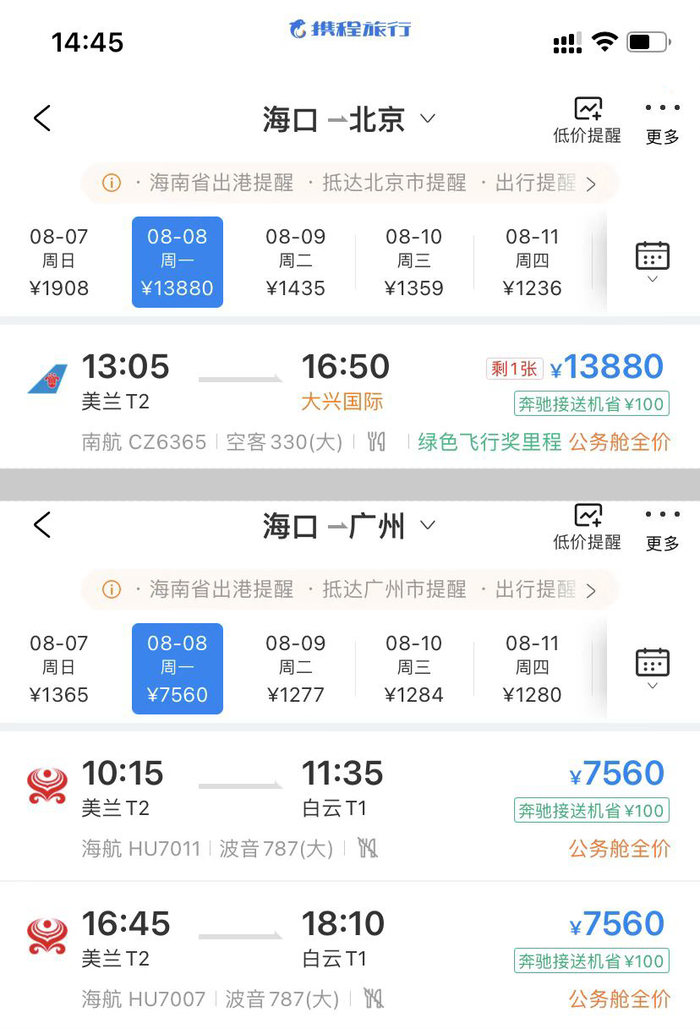 8月8日,海口至北京和广州已没有经济舱座位,截至发稿仅剩全价公务舱,飞广州票价为7560元,飞北京票价达到13880元。