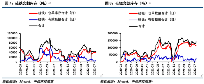 对比供给端和需求端的下滑幅度来看,供给端产量的下滑明显超过需求端,铁合金供需基本面存在阶段性好转的条件。但是,期现货价格表现依然偏弱。究其原因还是在于交割库存明显偏高。截止到8月5日,硅铁交割库存4.4万余吨,硅锰交割库存14.1万余吨,交割库存仍在高位对盘面价格造成压力。