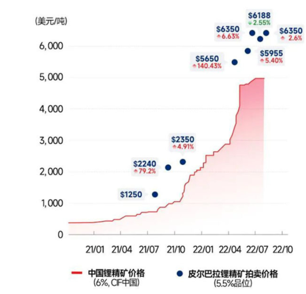 澎湃新闻记者了解到,从2021年7月起,皮尔巴拉开始在长协单以外,将部分散单锂精矿通过BMX电子交易平台拍卖。在全球五大锂矿巨头中,进行锂矿拍卖的独有皮尔巴拉一家。据业内人士分析,其目的是推动锂精矿拍卖定价,尝试争夺锂精矿定价权。由于锂精矿过去的营商模式以长协定价为主,锂精矿价格涨幅往往滞后于锂盐价格变化,且涨价幅度也低于市场锂价波动。拍卖制度的推出,有利于改变这一状况。8次拍卖以来,皮尔巴拉的锂精矿拍卖价格逐渐成为全球锂精矿以及锂盐价格走势的风向标。值得注意的是,皮尔巴拉的锂精矿历次拍卖价格都大大超过了当期市价。例如2022年5月,拍卖的锂精矿(精矿品位5.5, FOB黑德兰港基准)的价格为5955美元/吨,2022年6月的拍卖价格为6350美元/吨(精矿品位5.5, FOB黑德兰港基准)。