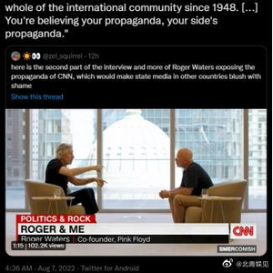 据环球网报道,北京时间7日,一段涉及中国大陆与台湾地区关系的采访视频在海外社交媒体平台引发关注。这段采访来自美国有线电视新闻网(CNN),对话二人分别是英国知名摇滚乐队平克·弗洛伊德(Pink Floyd)联合创始人、歌手罗格·沃特斯,以及CNN主持人迈克尔史默克,双方谈到沃特斯此前巡演中包含的政治元素,还谈到关于中国大陆与台湾地区的关系,沃特斯当面反驳史默克称:“台湾是中国的一部分”,他还告诫后者:“如果你不知道,那么你读书读得还不够。去读读书吧”。