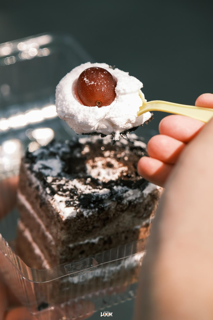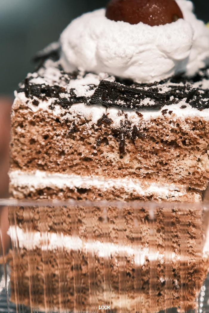 蛋糕奶油上点缀了半个葡萄(记忆中是黑樱桃),可可蛋糕胚与鲜奶油层叠,再5面都抹上巧克力碎碎。吃起来不会很甜,但巧克力就是偏代可可脂的味道,和浓郁肯定没啥关系。