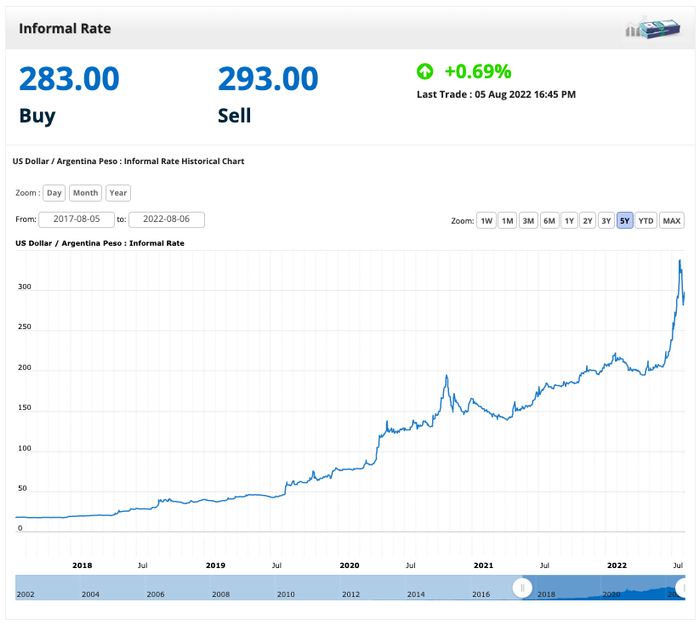 与此同时,阿根廷比索兑美元平行货币汇率(黑市)在7月19日突破1美元兑300比索的心理关口,7月22日更跌至1美元兑338比索的历史低点。
