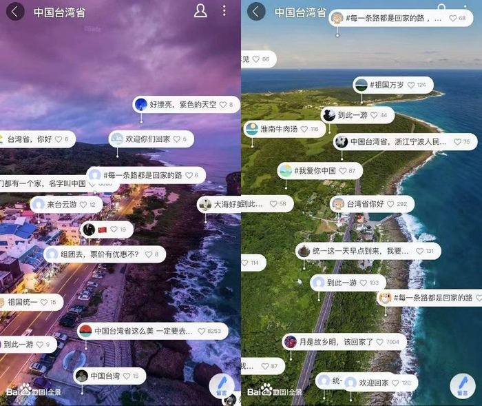 此外,在台湾省的全景照片上,还有大批热心的网友前来留言点赞。其中,有一个留言就写道:咱们的地图,咱们自己建。