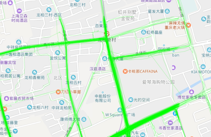 因此如果一条道路上出现了大量车辆行驶的轨迹,则将有大量的轨迹投影到地图上,结果就将呈现出如上图一样颜色深浅不一的线条。颜色越深的地方,说明轨迹越多。此时,就可以根据“是否持续有轨迹出现”来做出基础性判断,分析一条路是否存在或消失,进而判断一些路况信息。