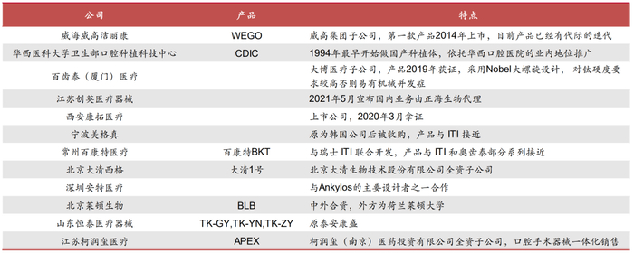 康拓医疗2020年3月取得钛及钛合金人工牙种植体系统三类注册证,商业化几无进展。国内种植体生产企业主要包括华西口腔医院、北京莱顿、威高洁丽康、大博百齿泰、江苏创英、宁波美格真、常州百康特、深圳安特、柯润玺。