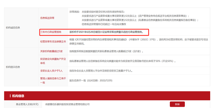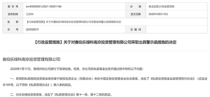 比如,2020年因存在向非合格投资者募集、管理的私募股权投资基金未在中基协备案等多项违规行为,江苏证监局对赛伯乐绿科南京投资管理有限公司出具了警示函;杭州赛伯乐绿科投资管理有限公司目前则为经营异常机构,处于被要求提交专项法律意见书期间;成都赛伯乐赢科股权投资基金管理有限公司于2021年6月28日被四川证监局采取出具警示函的行政监管措施。