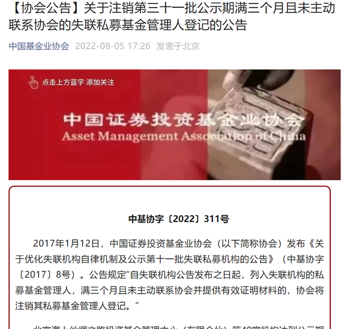 资料显示,2017年中基协便发布公告称,自失联机构公告发布之日起,列入失联机构的私募基金管理人,满三个月且未主动联系协会并提供有效证明材料的,协会将注销其私募基金管理人登记。