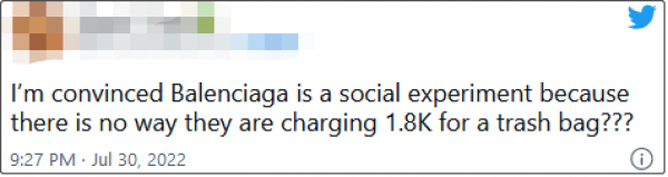 “我宁可认为巴黎世家这是在做一场社会实验,不然不可能一个垃圾袋卖这么多钱?”