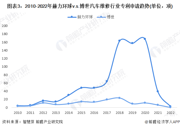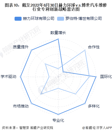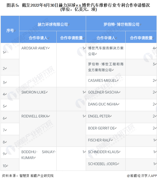 在专利合作申请方面,博世公司在汽车维修行业领域合作申请的专利数量较多,截至2022年6月30日共有20项,而赫力环球的合作申请专利仅有4项。