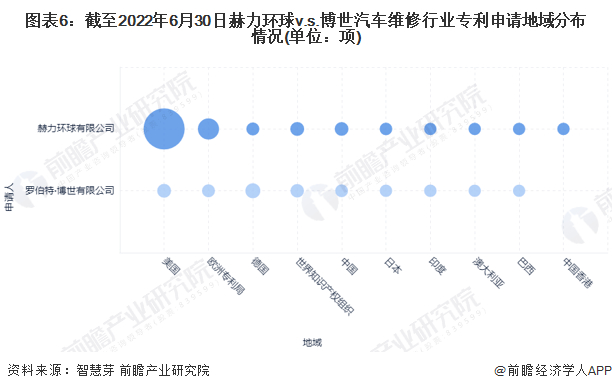 目前,赫力环球和博世公司的汽车维修行业专利申请区域主要集中在美国,两者在美国申请的汽车维修专利数量分别为849项和47项。单就博世公司来说,其总部所在地德国是其汽车维修行业专利申请最多的区域,截至2022年6月底共申请77项。