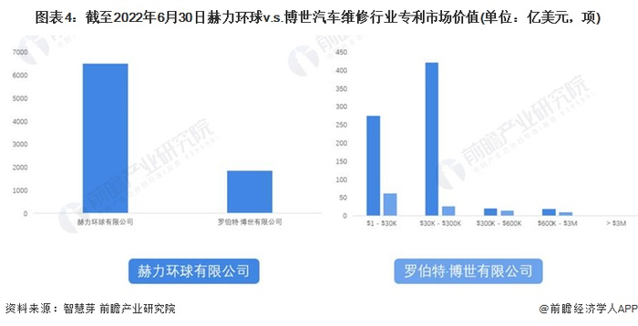 赫力环球汽车维修专利总价值高于博世汽车,截至2022年6月底,赫力环球汽车维修专利的市场价值为6488.25亿美元,博世公司汽车维修专利的市场价值为1847.41亿美元。