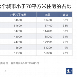 表1显示,在贝壳网(BEKE.N)挂牌的很多城市的二手房中,都有相当比例的房子建筑面积不足70平方米。