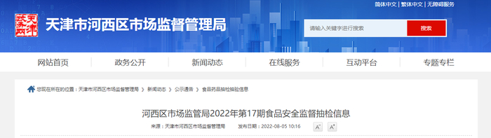 中国质量新闻网讯 近日,天津市河西区市场监督管理局网站发布河西区市场监管局2022年第17期食品安全监督抽检信息。