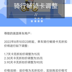 美团单车8月5日发布公告称,10日23时起,将对单车骑行畅骑卡无折扣价格进行调整。7天、30天和90天卡的无折扣价将调整为15元,35元和90元。实际上,美团单车不是第一个涨价的,早在今年1月,哈啰单车就已经将同样三档骑行卡的价格调整至同等水平。