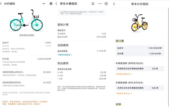 哈啰单车网站目前显示,其基础定价为“1.5元(15分钟以内)+1元/15分钟(超过15分钟时)”;美团单车为“起步价1.5元/30分钟(起步价)+1.5元/30分钟(时长费)”;滴滴青桔与美团单车基本一致。按此计算,若用户骑行时间为1小时,哈啰单车需人民币4.5元,美团单车和滴滴青桔需3元。