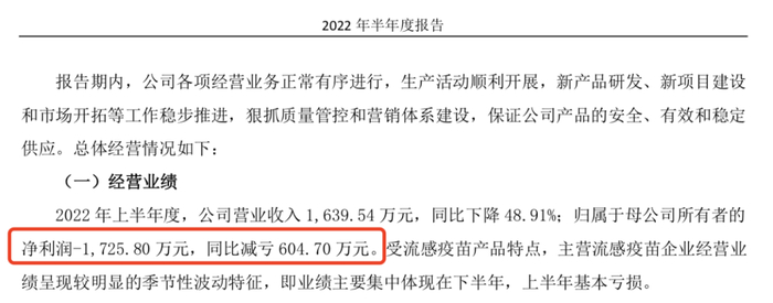 营业收入本报告期较上年同期下降48.91%,主要系(1)受新冠疫情影响,公司四价流感疫苗接种量同比下滑;(2)公司当期计提预计销售退货率冲减销售收入所致。净利润及扣非净利润主要系(1)报告期内,公司现金理财收益同比增加,财务费用同比减少,使亏损额减少;(2)销售收入同比下降,使扣除非经常性损益后的亏损额增加所致。