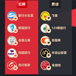 红榜:智行火车票、携程旅行、去哪儿网、悦程出行、同程旅行、出行唯选、高铁管家、全球畅行联盟、龙行管家、悦乐程