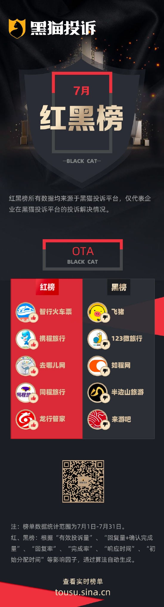 7月黑猫投诉OTA领域红黑榜——飞猪预定酒店、门票拒绝退款