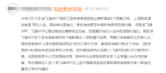 黑猫投诉平台上,有大量消费者投诉在飞猪平台购买机票、酒店等退款问题。有用户反馈在飞猪上预定的酒店和上海迪士尼门票,申请退款时客服反馈订单不支持退款。还有用户投诉在飞猪购买的亚特兰蒂斯酒店预售订单,被酒店告知有效期至年底所有房间无房约满,而飞猪以酒店给出的满房凭证为由,拒绝履行合约入住并拒绝赔付违约。7月黑猫投诉平台共收到针对飞猪的投诉760单,截至目前无一回复。