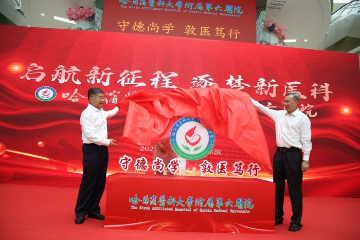 哈尔滨市委副书记、哈尔滨新区党工委书记代守仑和哈医大党委书记张斌揭幕院徽、院训。受访者供图