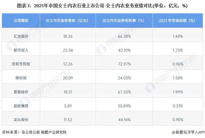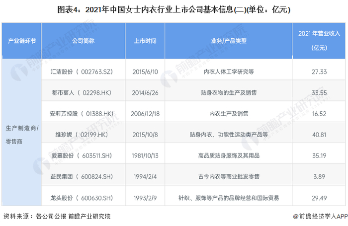 女士内衣行业主要上市公司:汇洁股份(002763.SZ)、都市丽人(02298.HK)、安莉芳控股(01388.HK)、维珍妮(02199.HK)、爱慕股份(603511.SH)、益民集团(600824.SH)、龙头股份(600630.SH)
