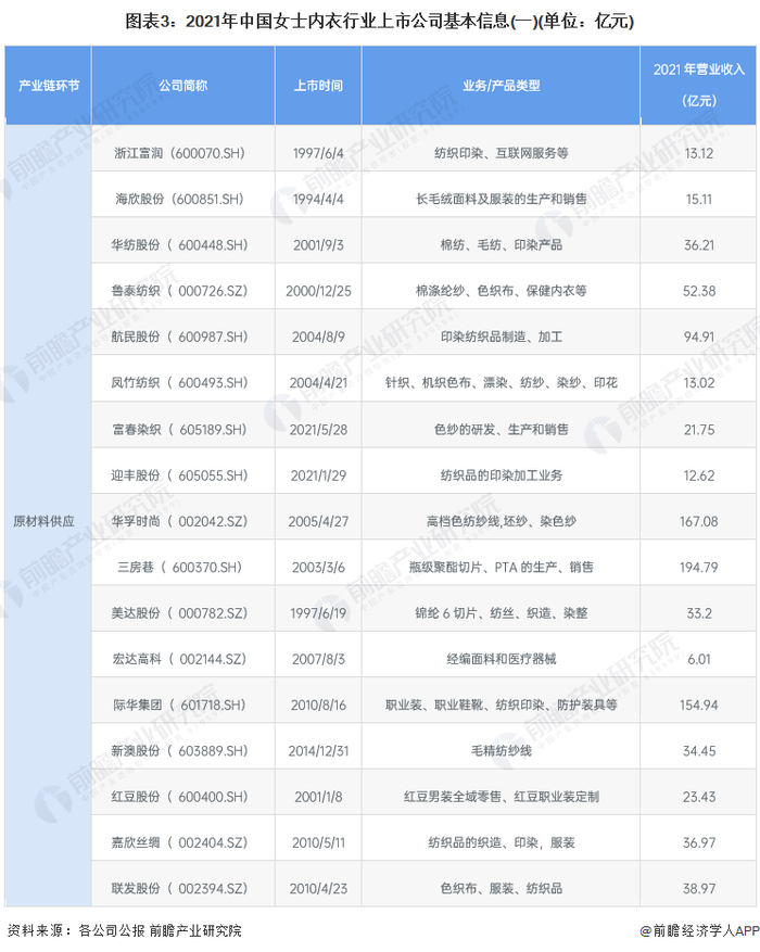 原材料供应上市公司:浙江富润(600070.SH)、海欣股份(600851.SH)、华纺股份(600448.SH)、鲁泰纺织(000726.SZ)、航民股份(600987.SH)、凤竹纺织(600493.SH)、富春染织(605189.SH)、迎丰股份(605055.SH)、华孚时尚(002042.SZ)、三房巷(600370.SH)、美达股份(000782.SZ)、宏达高科(002144.SZ)、际华集团(601718.SH)、新澳股份(603889.SH)、红豆股份(600400.SH)、嘉欣丝绸(002404.SZ)、联发股份(002394.SZ);