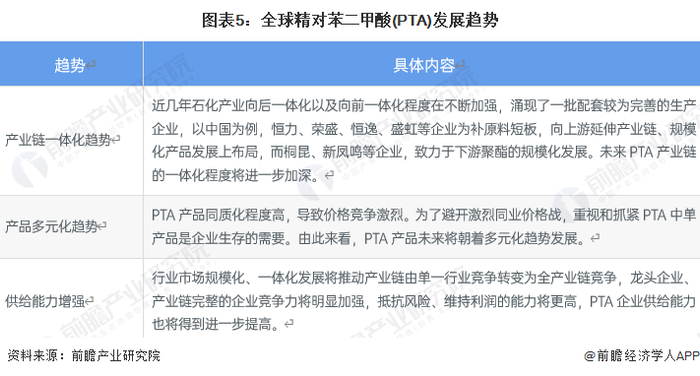 结合全球精对苯二甲酸(PTA)的供需现状来看,目前全球精对苯二甲酸(PTA)产销情况较好。PTA产品总体同质化程度较高,预计未来PTA产品将朝着多元化趋势发展。除此之外,近年来产业链一体化现象在PTA相关行业中较为产业,预计未来PTA产业链的一体化程度将进一步加深。具体发展趋势如下: