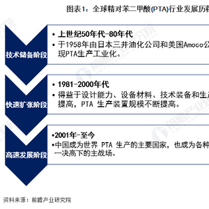 自上世纪60年代PTA生产工业化以来,得益于设计能力、设备材料、技术装备和生产管理水平的不断提高,PTA生产装置规模不断提高。2000年以后,中国成为世界PTA生产的主要国家,也成为各种PTA生产工艺技术一决高下的主战场。全球精对苯二甲酸(PTA)行业发展历程主要分为三个阶段,技术储备阶段(1924-1950)、快速扩张阶段(1950-1970)及高速发展阶段(2001-至今)。