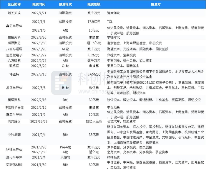 据创投通数据,自去年7月以来,国内半导体材料生产领域有18家企业完成融资。