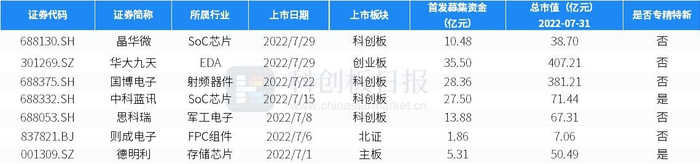 7月半导体产业链有7家公司A股上市,总募资额达122.89亿元。2家企业开展定增,增发预案募资资金共35.5亿元。