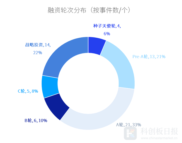 从投资轮次来看,7月半导体领域投资大多集中于早中期企业,其中A轮融资事件数目最多,发生21起,占比约为33%;战略投资事件数目位列第二,发生14,占比约22%;Pre-A轮融资事件数目位列第三,发生13起,占比约21%。