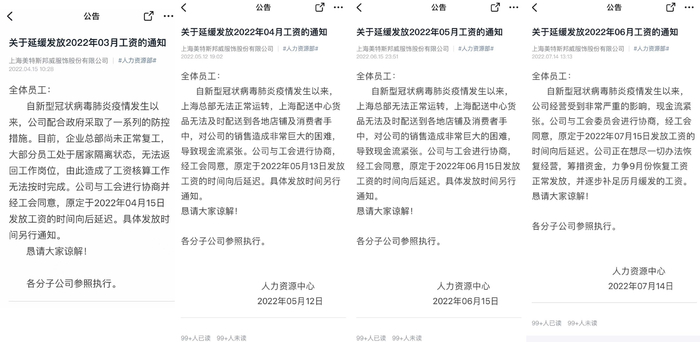 彼时,上海正实行严格封控防疫政策,周峰与同事都认为公司此举也实属无奈。但令他没想到的是,距离公司第一个延薪日已经过去近4个月,包括周峰在内的美特斯邦威员工等来的是4份未盖有公司公章的“延薪通知”。