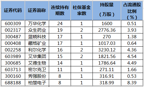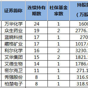 数据宝统计,截至8月9日,公布半年报公司中,社保基金最新出现在35家公司前十大流通股东榜,向前追溯发现,共有21只股获社保基金连续持有4个季度以上。其中,13只社保基金持有期超过两年。社保基金持有期限最长的个股是万华化学,自2016年三季度以来已累计持有24个季度,持股量合计为1600万股。社保基金持有期限较长的还有众生药业、藏格矿业、蓝晓科技等,已连续持有19、17、17个季度。