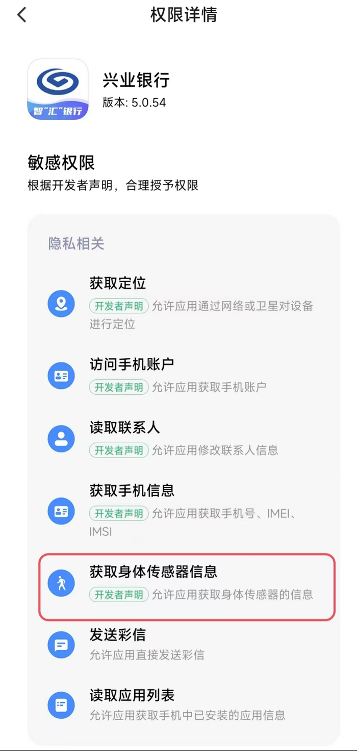 于是,我们拨打了兴业银行客服电话询问。客服人员表示不是很了解。我们根据客服人员提供的链接重新下载,通过手机权限管理发现有应用在访问“身体传感器”,而这款应用还是兴业银行。