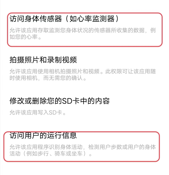 我们发现,安卓系统vivo应用商店显示,兴业银行APP(版本5.0.54)需要获取21项权限,其中包括“访问身体传感器(如心率监测器)”,对于该权限的解释是“允许该应用软件存取监测您身体状况的传感器所收集的数据,例如您的心率”。同时,兴业银行APP还要获取“访问用户的运行信息”,该权限的解释是“允许该应用程序识别身体活动,检测用户步数或用户的身体活动(例如步行、骑车或坐车)”。