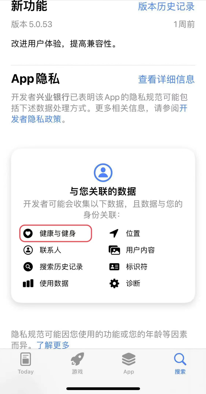 这让我们感到匪夷所思。因为按常理,兴业银行作为一款金融服务类APP,消费者的健康状况与健身活动数据貌似与金融业务没有太大的关系。