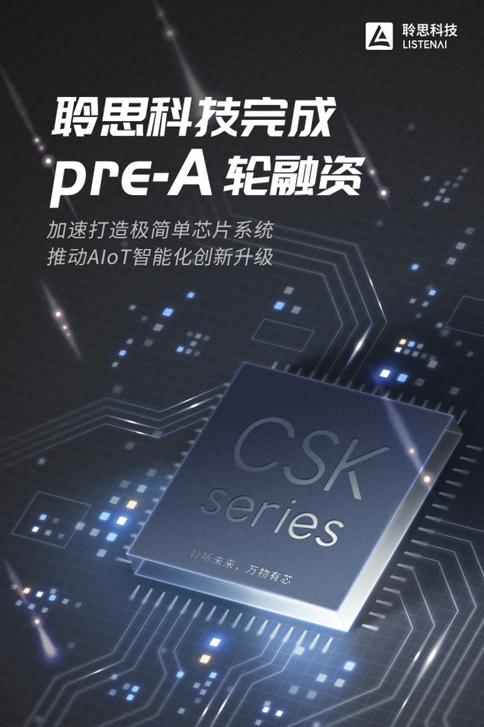 投资界(ID:pedaily2012)8月9日消息,近日,聆思科技完成数亿元pre-A轮融资,本轮融资由元禾璞华领投,沄柏资本联合领投,天际资本、中银集团旗下渤海基金、天智投资、连山基金跟投,天智投资提供独家融资顾问服务。本轮融资资金将主要用于自研芯片的研发投入与人才建设,加速布局AIoT智能化市场,助力聆思科技成为万物智联时代终端智能SoC芯片的领军企业。