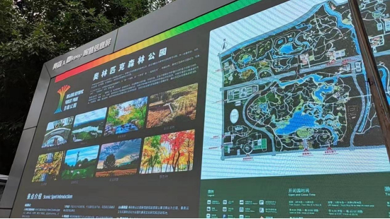 首先,进入南园,门口有面3m*5m的‘智慧大屏’,有别于传统大屏,这块‘智慧大屏’不仅会显示园区地图、人数,还会呈现奥森跑友的速度排行榜。在‘科技智慧’跑道上跑完一圈,可以在这块大屏前看看自己是否‘榜上有名’。