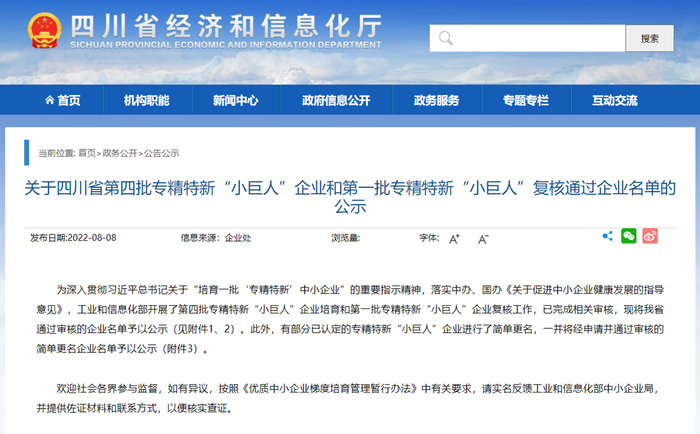 日前,四川省经济和信息化厅发布了四川省第四批专精特新“小巨人”企业和第一批专精特新“小巨人”复核通过企业公示名单。此外,还对已认定的专精特新“小巨人”企业进行了简单更名。此次名单公示期截至8月12日。