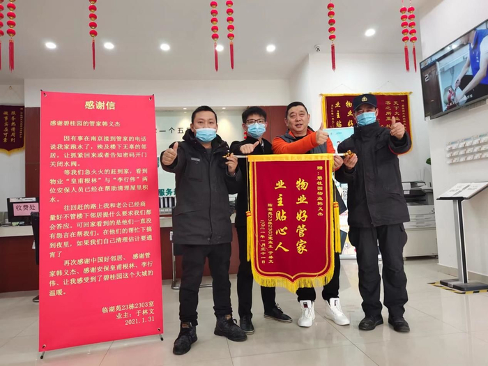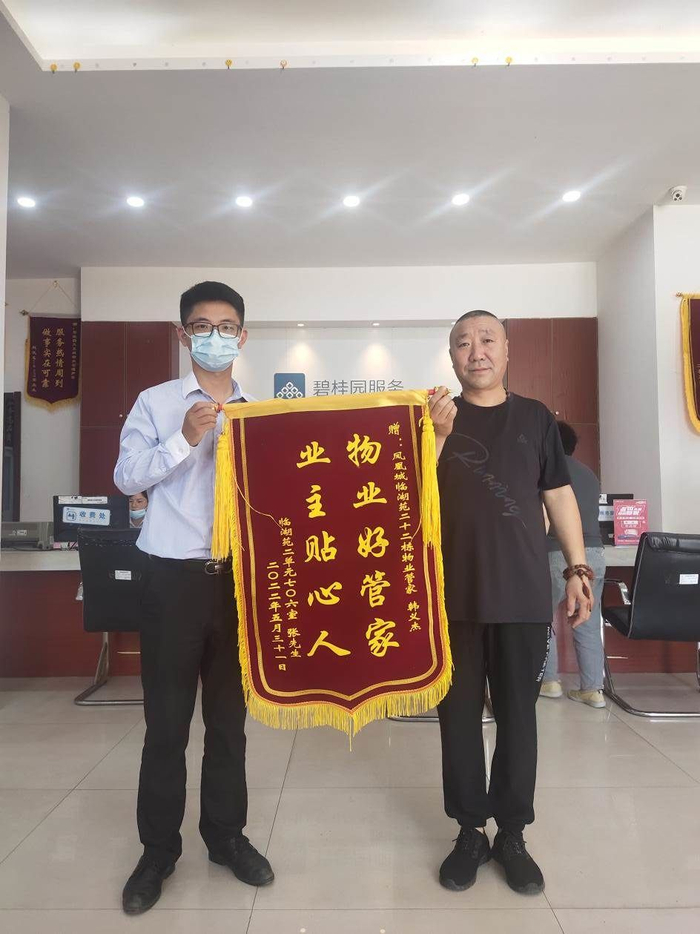 “小韩,我们在南京的水果批发市场有疫情被风控了,暂时回不去了,有个事都急死了,人回不去,小狗在家呢,还不知道封到什么时候,怎么办啊“我当时想也没想就说交给我吧,接着我就每天去给小狗喂食,清尿,铲屎,拖地,装水,持续了一个月。业主回来后,非常感谢,激动地说要送一面锦旗 ,以表心意。