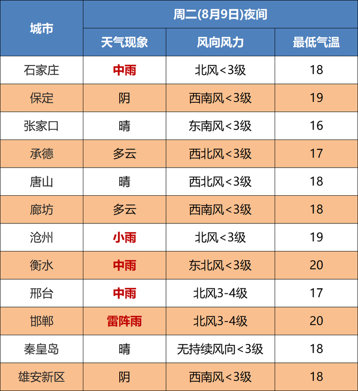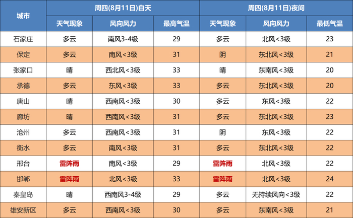 明天夜间到11日,石家庄、沧州及以南地区阴有雷阵雨或阵雨局地有中到大雨,其他地区多云。