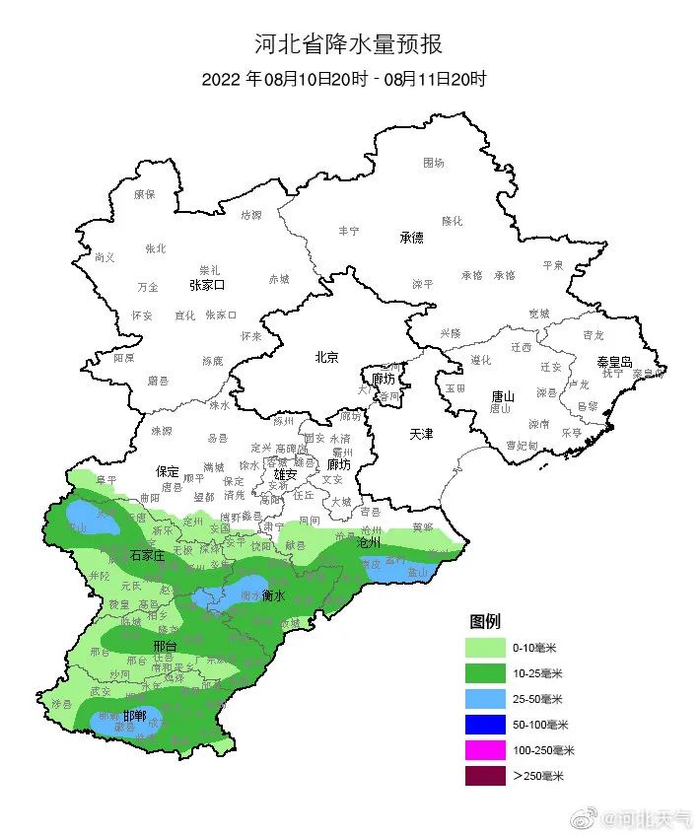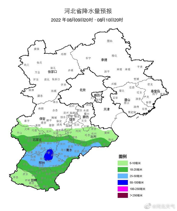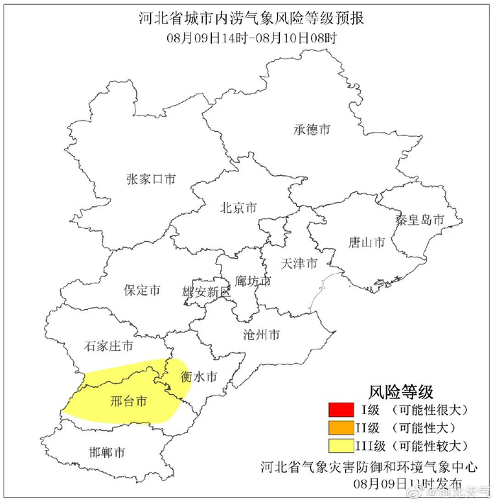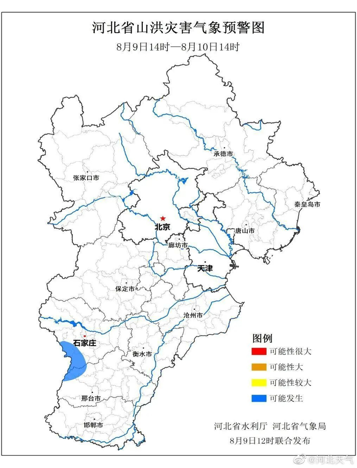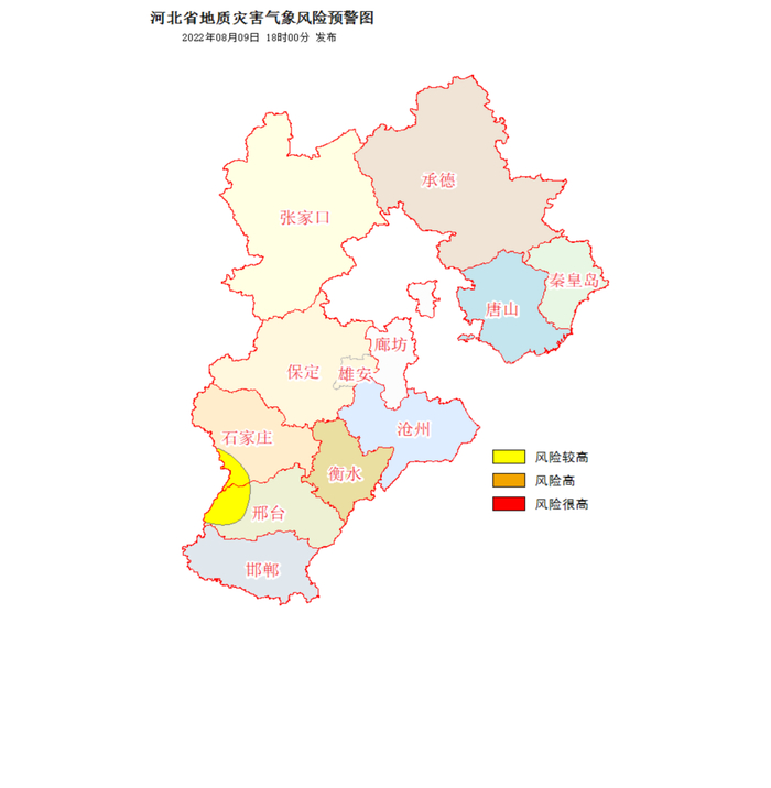 自8月9日20时至8月10日20时,石家庄市(元氏县、赞皇县、井陉县)、邢台市(临城县、内丘县、沙河市、信都区)发生崩塌、滑坡、泥石流等地质灾害风险较高(黄色预警)上述地区有关责任单位和监测人员要做好地质灾害监测、巡查、转移避险等防范工作。