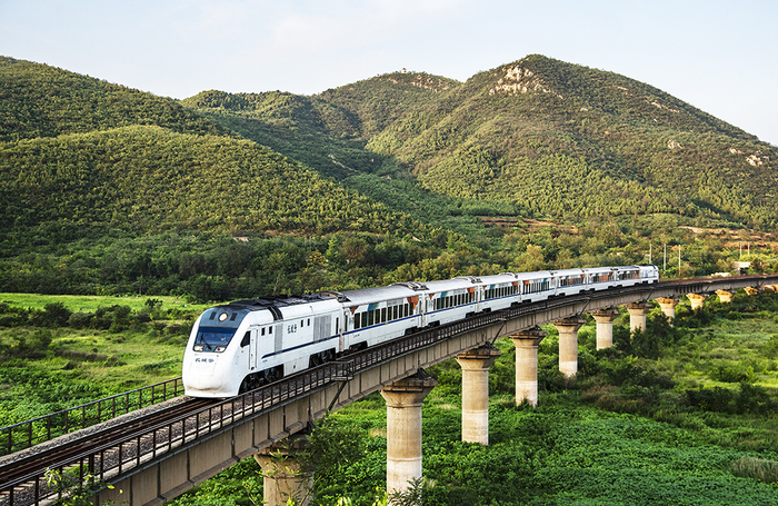 2020年7月31日,北京市昌平区桃峪口水库,京通铁路线/北京市郊铁路S5怀柔-密云线,由中国中车集团旗下戚墅堰公司设计制造的NDJ3型和谐长城号内燃动车组担当的清河-昌平北-雁栖湖-怀柔北-古北口的北京市郊铁路S5怀柔-密云线的市郊通勤列车。列车正在通过京通铁路桃峪口水库大桥。
