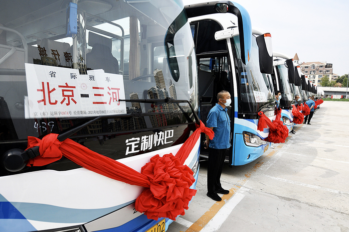 2022年7月22日,北三县通勤定制快巴试点运营开通仪式在河北省三河市燕郊举办,一批48座的崭新大巴整装待发。