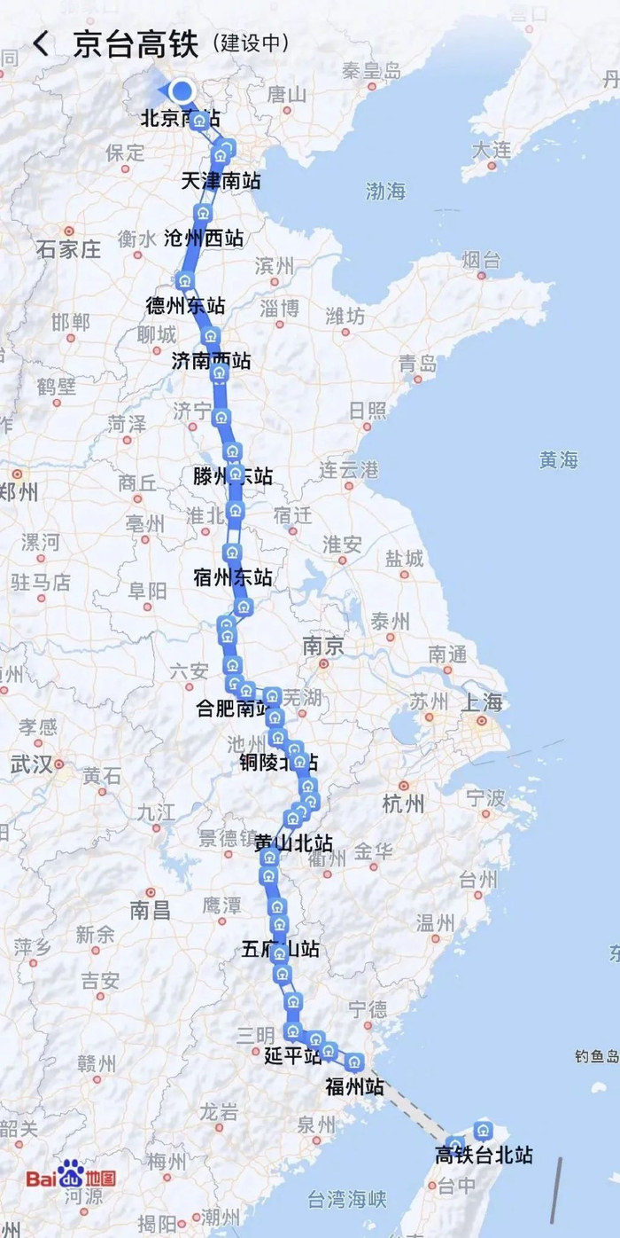 最近,#台湾地图#频频登上热搜!据中国新闻社报道,8月8日,有记者发现,台湾地图又双叒“更新”了!地图已可显示京台高铁线路图,通过手机地图软件搜索“京台高铁”,已可显示京台高铁线路图(建设中)。根据地图软件,京台高铁起点为北京南站,经廊坊、天津、沧州继续向南,在台湾省设高铁新竹站,终点为高铁台北站。