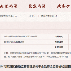中国质量新闻网讯 8月9日,浙江省湖州市南浔区市场监督管理局发布关于食品安全监督抽检结果的公告(2022年第19期)。