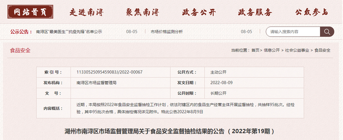 浙江省湖州市南浔区市场监管局发布食品安全监督抽检结果(2022年第19期)