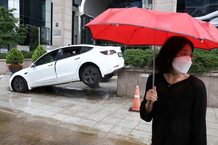 当地时间2022年8月9日,韩国首尔,一辆受损的汽车倾斜在人行道上。