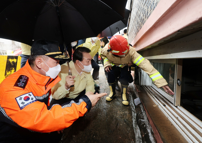 当地时间2022年8月9日,韩国首尔冠岳区,韩国总统尹锡悦查看新林洞暴雨受灾情况。这个半地下住宅昨晚被水淹没导致人员伤亡。